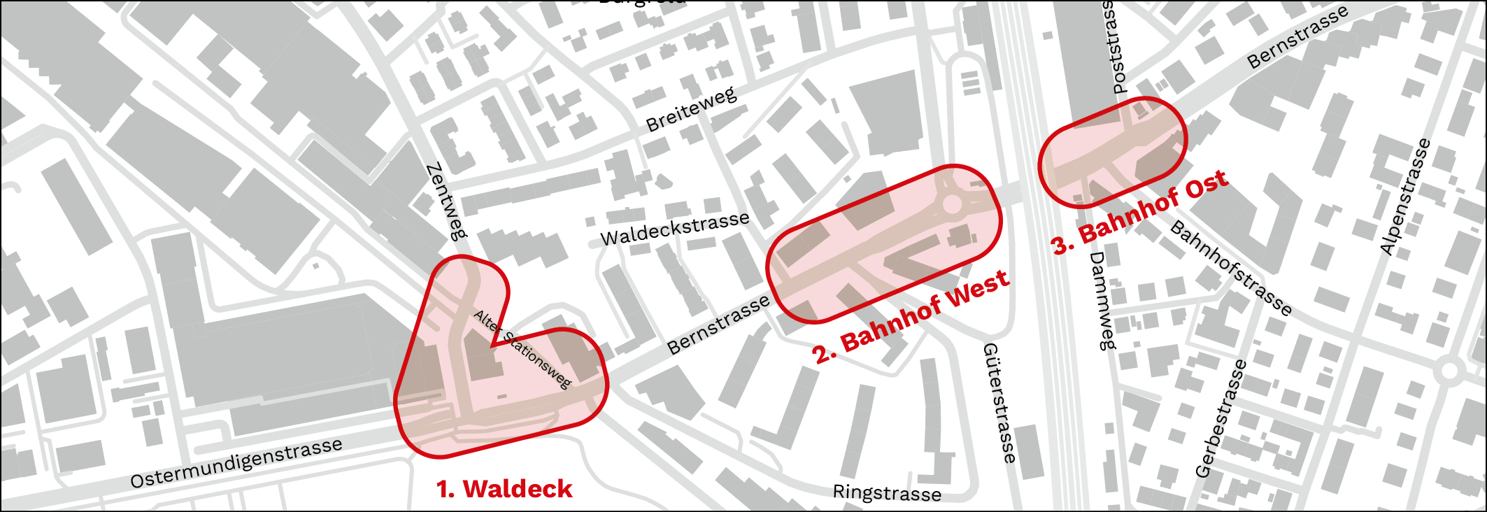 2. Bahnhof West: rund um den Bärenkreisel, einschliesslich der Rampe zum Bahnhof, sowie bei der Abzweigung Bernstrasse/Waldeckstrasse.