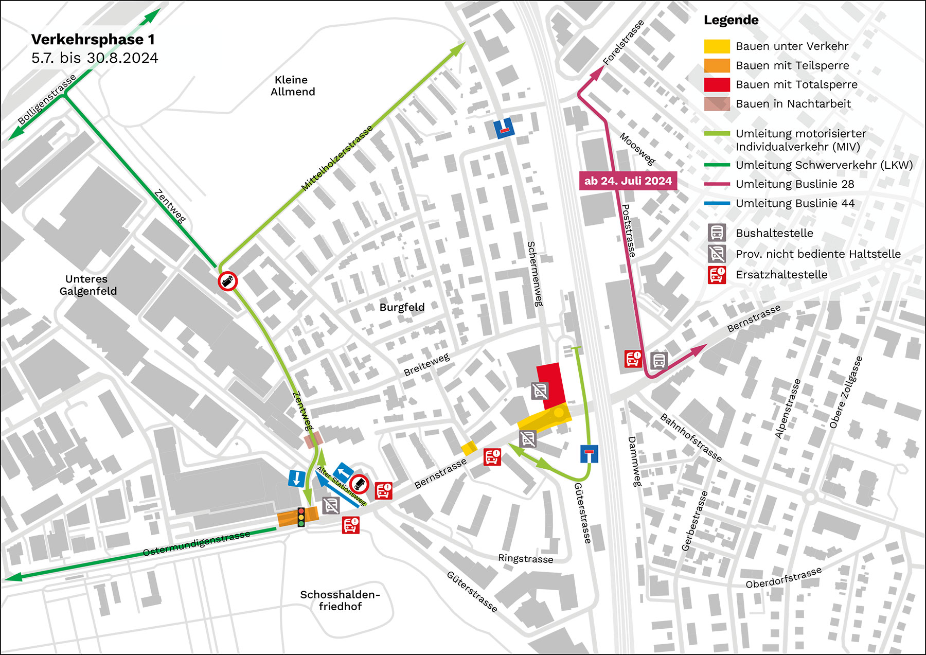 • Die Verbindung zwischen der Bernstrasse und dem Schermenweg bleibt für den ÖV, Velofahrende und den motorisierten Individualverkehr vollständig gesperrt. Der Individualverkehr wird weiterhin über den Zentweg und die Mittelholzerstrasse umgeleitet, die Buslinie 28 über die Poststrasse.